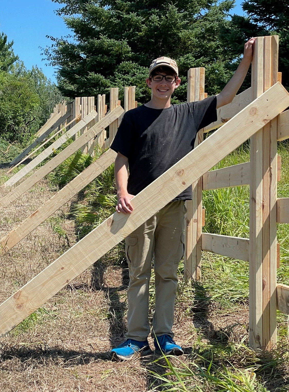 In his words: “For my Eagle Scout project, I built a fence for the Community Garden in Chatham, Michigan. First, I partnered with the Alger County Conservation District and reviewed what needed to be done for the community garden. I chose to build a boundary fence and install a culvert for a parking pad. Next, I assessed what materials and finances the project already had for me to use. Finally, I designed a post and rail fence and planned a work day. My help for this project included the Superior Central School Cross Country and Track teams, Munising BSA Troop 332, Michigan State University Extension Research Farm, and The Alger County Conservation District. This fence benefits Chatham Township’s community garden plan as it protects neighboring property owners from unwanted trespass from the users of the Community Garden. It also is designed to be a boundary from the newly planted native pollinator garden.”