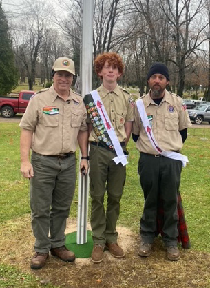 In his words: “For my Eagle Scout project, I installed a flagpole at the new veteran’s memorial site in Maple Grove Cemetery. Troop 332 had volunteered at the cemetery’s memorial for 3 years providing clean-up. I always thought the memorial needed a flag to honor our veterans. I asked for and received the blessing of the local VVA. They were excited and offered support. The local community provided above and beyond the needed donations. The extra is in a fund at the VVA for flag and flagpole maintenance. I had help from my troop, my family, and a lot of support from the community members and community businesses. We were able to host a flag raising ceremony on Veterans day, it was a proud day for everyone involved. I wanted to do this because it is important to remember men and women in our community that have served for our country. The American flag helps to reflect on the history of our country and preserve patriotism for our future.”