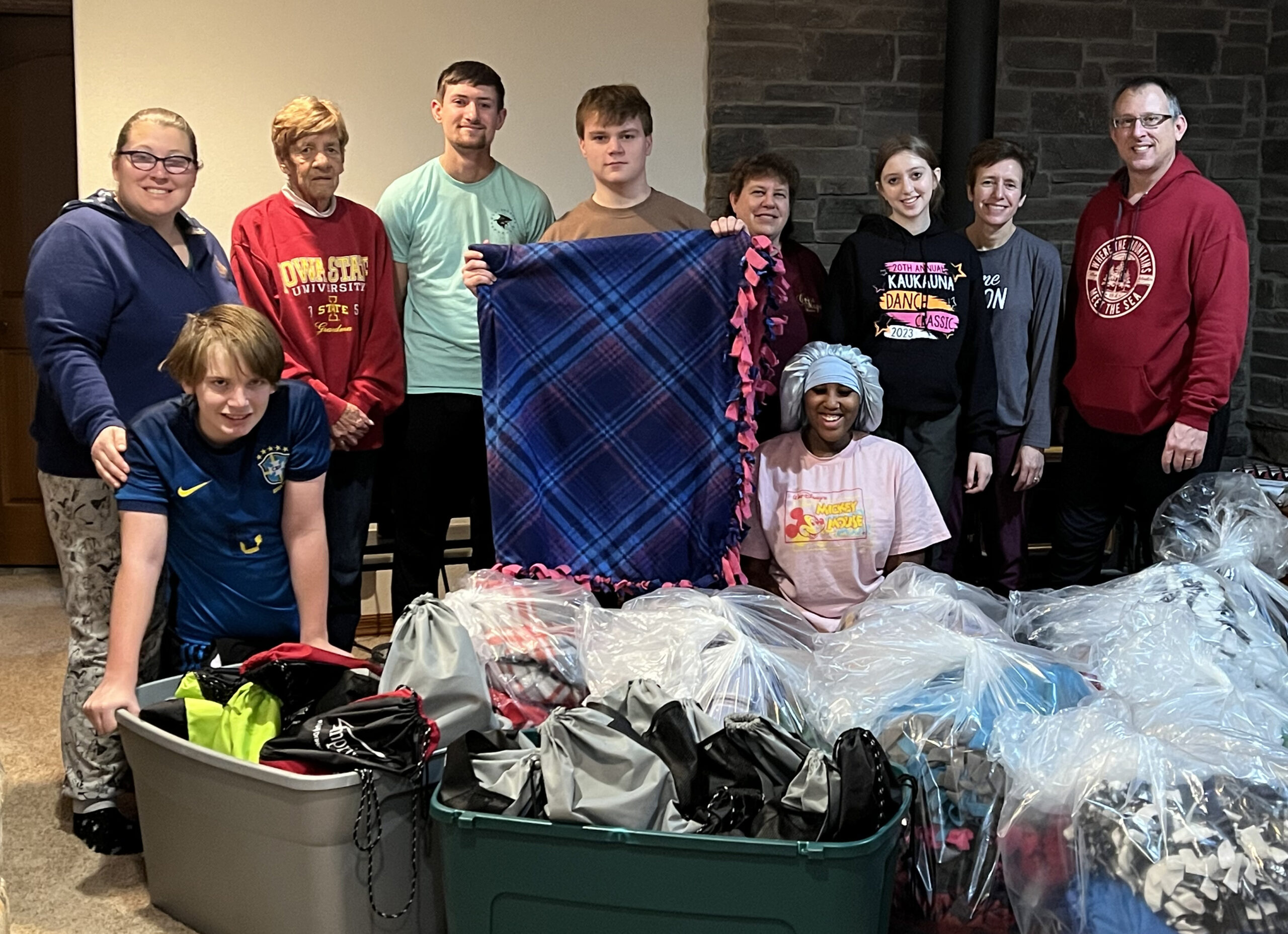 His Eagle project, in his own words: “I lead a project to make 50 tie blankets and 50 personal hygiene kits to donate to the Day by Day Warming Shelter in Oshkosh. The project was completed in a day and a half over a weekend with 25 helpers and a total of 151.25 total hours worked. The blankets will help to provide warmth to the people in need who come to the shelter. The hygiene kits will provide guests at the shelter with hygiene essentials for their day to day lives.”