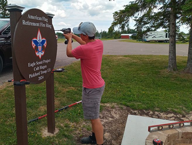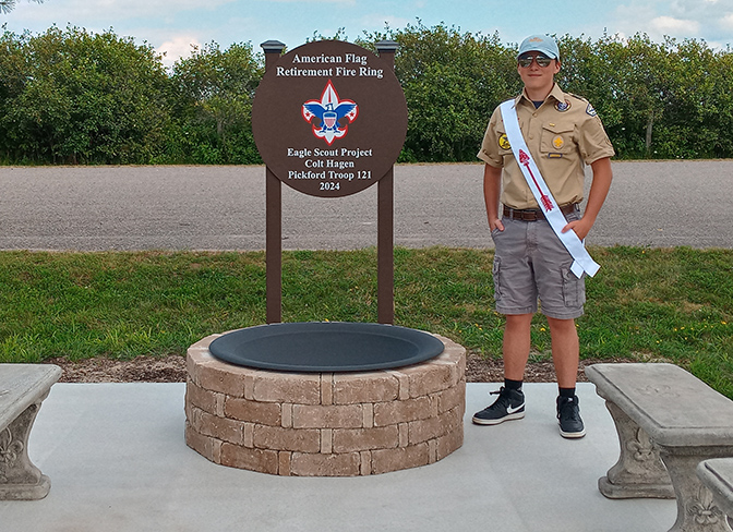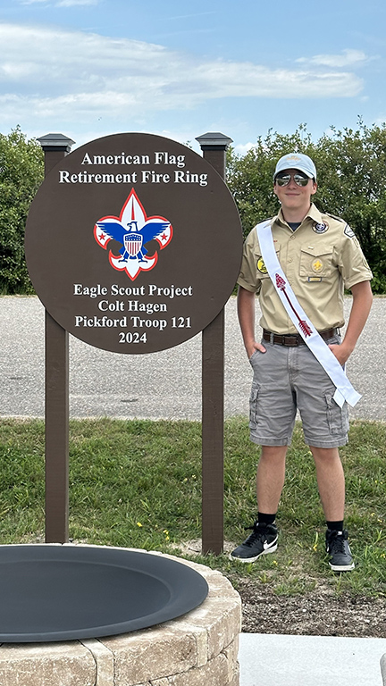 Colt Hagen, a member of Troop 121, chartered by the Pickford Lions Club of Pickford MI, completed his Eagle Board of Review on August 27, 2024. Colt’s Eagle Scout project, located at the Pickford Township Park, created a dedicated area for the citizens of Pickford, American Legion, VFW, or any other organization a place to respectfully retire worn or faded American flags. His unit leaders are Eric Gallentine (Scoutmaster) and Larry Hagen (Assistant Scoutmaster.) Colt’s Eagle Court of Honor is expected next spring.
