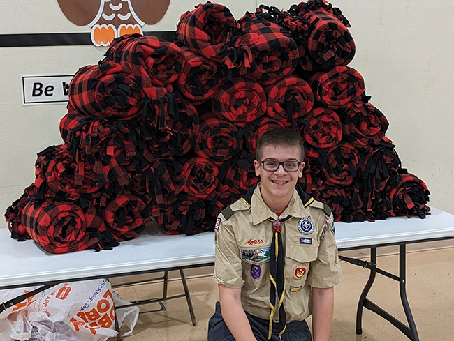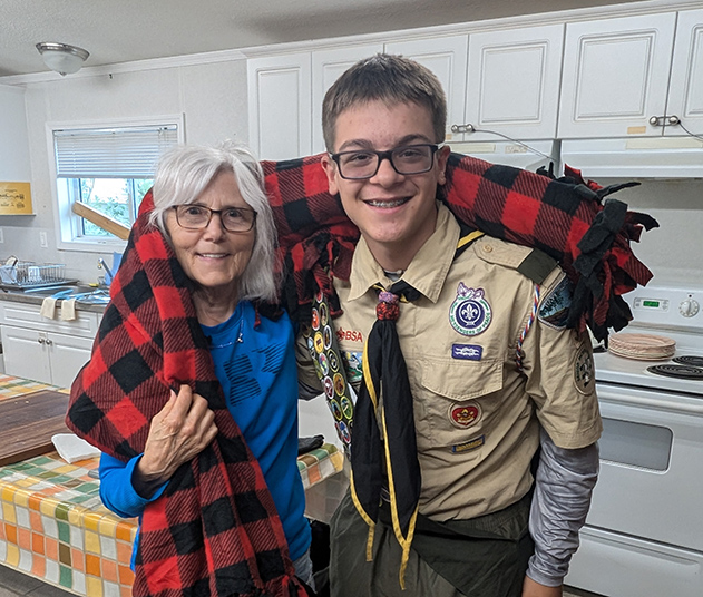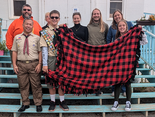 His Eagle project in his own words: “I organized my school to collect socks and organized my troop and family to make 30 fleece tie blankets. After collecting the socks and making the blankets I packed them up and my family and I took them along with us on our summer vacation to be delivered to the Our Lady of Victory Catholic Church in Inuvik, Northwest Territories, Canada. In order to make this delivery, we drove nearly 3,500 miles crossing all of western Canada, traveling up the Alaska Highway, Klondike Highway and then on to the Dempster Highway which is a 600 mile long gravel road that crosses the Arctic Circle. We arrived in Inuvik and delivered the blankets on August 1, 2024. The church held a potluck dinner and invited members who had been Scouts in their youth. We met Scouts from Ireland, The Philippines, The Czech Republic, and Canada. Inuvik is a low income, Arctic community, of mostly indigenous residents who are members of the Gwich’in, Inuvialuit, and Metis People. These blankets and socks will help keep them warm during the brutal winters they experience on the tundra.”