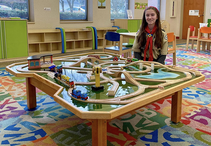 In her words, Arrah’s Eagle project: “I worked with the local public library to update the worn out train table top in the children’s area and then built two custom benches to be used for pretend play. The train table is the most used item in the children’s area. The best part about updating the train table is that the new track layout was done 100% by scouts – we sent the adults away on a hike so that the final project could be envisioned by those it was intended for – youth.”