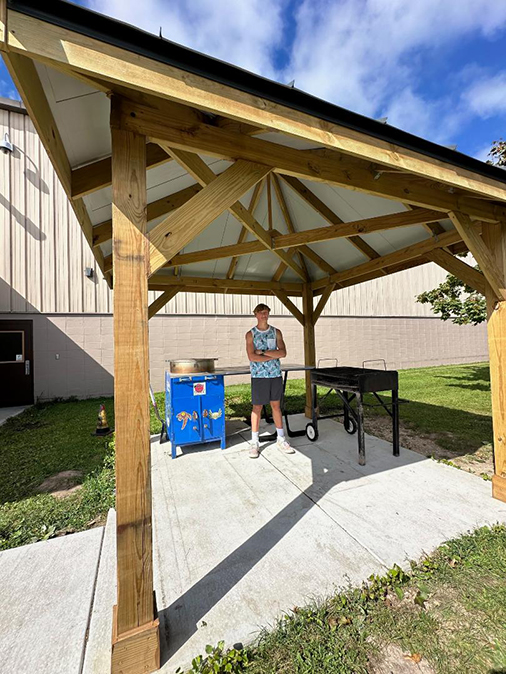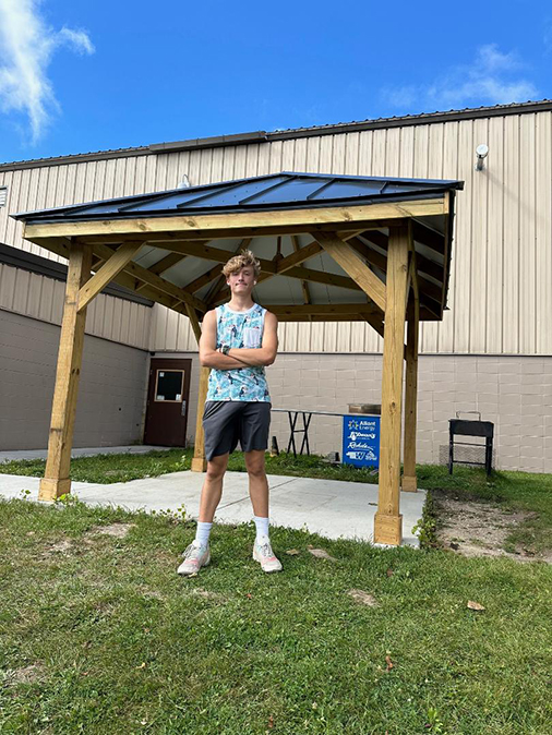 In his words, “While my younger brother was participating in a hockey tournament at the local hockey rink, Sheboygan Lakers Blue Line, my step-dad was volunteering to grill brats to sell at the tournament. It happened to be raining/snowy and miserable by the grill. So while brainstorming ideas for my Eagle Scout project, I thought about building a Grill Hut gazebo for the rink to help out the numerous volunteers that grill nearly every weekend and for big events. I worked with local organizations to get the lumber, metal roof, and hardware donated for this project. The rink installed a large concrete platform. Over the course of a year, I found a plan, prepped materials, and coordinated helpers. During the summer of 2024, over five different workdays, and with the help of roughly 20 friends, family, and fellow scouts, we completed a strong and sturdy grill hut. I’m hopeful this will last for many years to come and help the many rink volunteers stay warmer and drier in the future.”